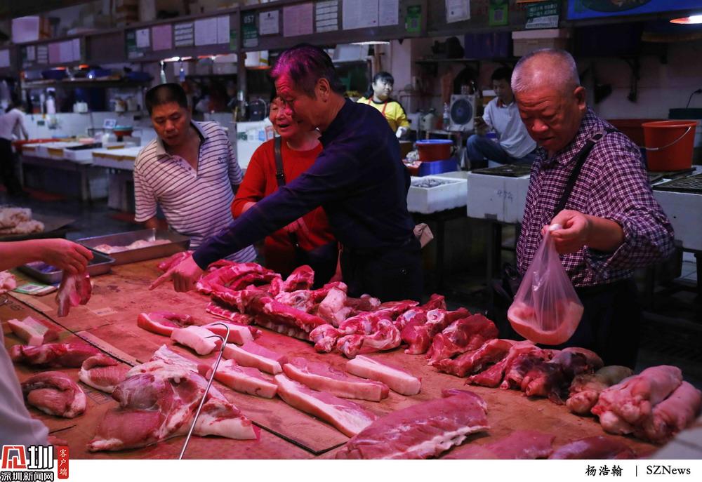 2019年11月18日,福田農(nóng)批市場,三位正在選購豬肉的市民。