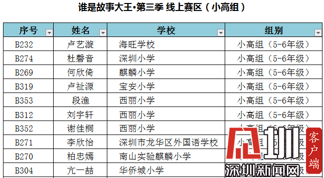 見圳客戶端、深圳新聞網(wǎng)2019年11月22日訊 (見圳客戶端、深圳新聞網(wǎng)記者 陳彬)11月22日,“誰是故事大王·第三季”線上賽區(qū)晉級深圳市復(fù)賽的名單出爐,最終,小中組劉沐芯、梅可欣、鐘欣妍等10人,小高組盧藝漩、杜磬音、何欣倚等10人,從線上賽區(qū)1000多人中脫穎而出,晉級深圳市復(fù)賽。自此,“誰是故事大王·第三季”的海選全部結(jié)束,從36個“校園賽區(qū)”、“南山分賽區(qū)”、“線上分賽區(qū)”、“特約專場”等賽區(qū)晉級的240位學(xué)生成功進(jìn)入深圳市復(fù)賽,深圳市復(fù)賽將于12月14日(小中組)、12月15日(小高組)進(jìn)行。