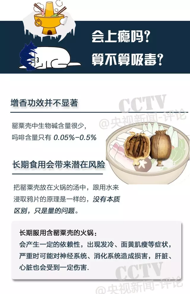 初次食用加入了罌粟殼的火鍋或小吃后,一般有心跳加快、臉色微紅、不易入睡等感覺,這種情況因個體差異及火鍋中罌粟殼含量而有所不同。