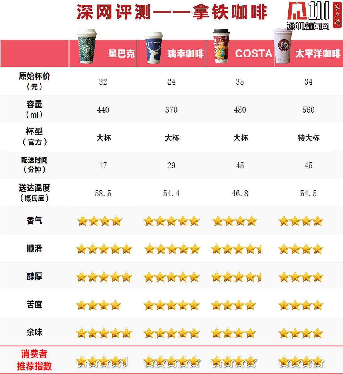 為了一探究竟,深圳新聞網(wǎng)測評小組聯(lián)合專注產(chǎn)品質(zhì)量、消費服務專業(yè)組織中國質(zhì)量萬里行,邀請了來自新聞、餐飲、IT以及其他行業(yè)的20位咖啡愛好者,對深圳市面上主流的星巴克、瑞幸、太平洋、COSTA 4個品牌,2種口味【“拿鐵(熱)”、“美式(熱)”】的咖啡,通過主觀+客觀的形式進行了測評。