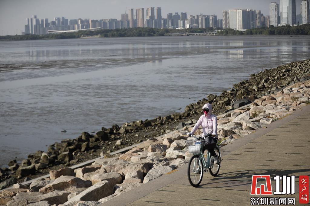深圳灣公園,一位市民穿著羽絨服出行。