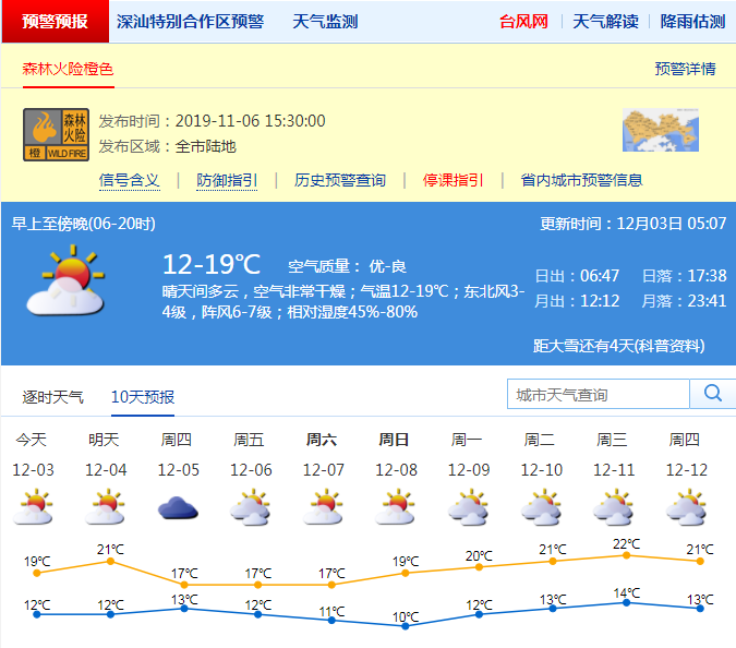 見(jiàn)圳客戶(hù)端·深圳新聞網(wǎng)2019年12月3日訊 近兩日,深圳風(fēng)力清勁,不少市民反饋“終于有個(gè)秋天的樣子”。記者從市氣象臺(tái)獲悉,預(yù)計(jì)3日晴天間多云,空氣非常干燥,氣溫12℃至19℃,陣風(fēng)6級(jí)至7級(jí)。4日氣溫短暫回升,氣溫12℃至21℃。5日至7日冷空氣繼續(xù)補(bǔ)充影響,風(fēng)力再次加大,氣溫進(jìn)一步下降。其中,5日氣溫13℃至17℃,6日氣溫12℃至17℃,7日氣溫11℃至17℃。