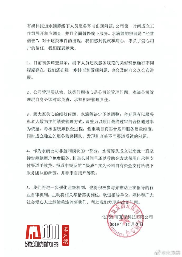 見圳客戶端.深圳新聞網(wǎng)2019年12月6日訊(見圳客戶端、深圳新聞網(wǎng)記者 張玲)2019年11月30日,據(jù)梨視頻報道,互聯(lián)網(wǎng)籌款平臺“水滴籌”在超過40個城市的醫(yī)院派駐地推人員,線下地推服務(wù)人員被指在醫(yī)院“掃樓”尋找求助者,套用模板,隨意填寫金額,不審核甚至隱瞞求助者財產(chǎn)狀況,鼓勵患者大量轉(zhuǎn)發(fā)籌款信息。同日,水滴籌通過微博官方認(rèn)證公眾號回應(yīng)稱,已第一時間成立緊急工作小組開展相關(guān)情況排查,同時線下服務(wù)團(tuán)隊(duì)全面暫停服務(wù),整頓徹查類似違規(guī)行為,并對梨視頻報道可能引發(fā)的誤解進(jìn)行了3點(diǎn)說明。