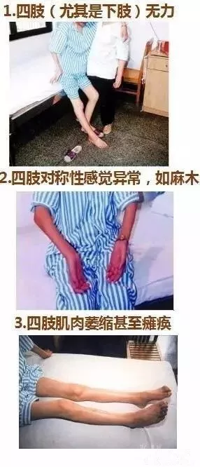 癥狀表現(xiàn)為肢體遠(yuǎn)端麻木、疼痛、下肢沉重感,跟腱反射減弱或消失,四肢遠(yuǎn)端肌肉明顯萎縮,影響運(yùn)動(dòng)功能。