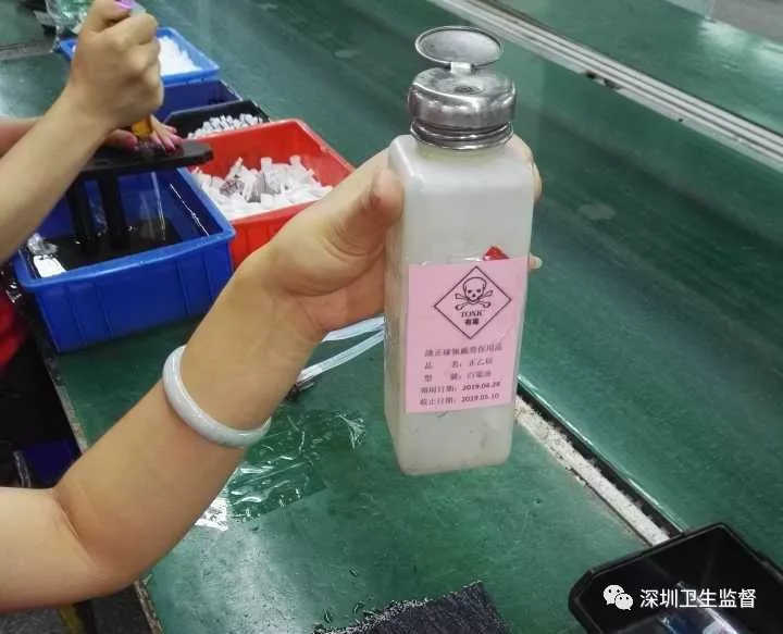 檢查過(guò)程中發(fā)現(xiàn)該公司A棟2樓水箱車(chē)間,可見(jiàn)組裝線組裝崗位工人韋某正在使用白電油(成分顯示為正己烷)作業(yè),未見(jiàn)佩戴防護(hù)指套。