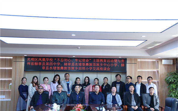 研討課后,光明區(qū)委教育工委副書記嚴亮,鳳凰學校校長華建明,校長助理王珍、何運敏等與赫章縣教育同仁共同參加了 “不忘初心、牢記使命”主題教育交流座談會。