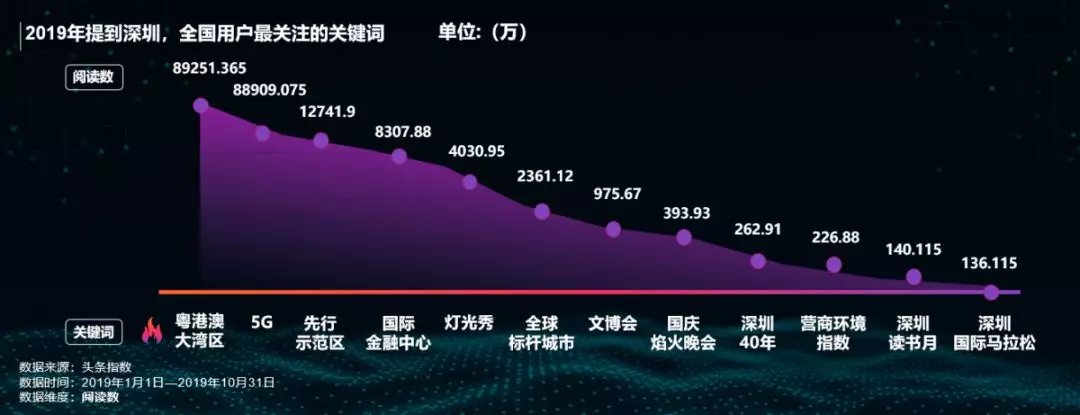 數(shù)據(jù)顯示,2019年提到深圳,全國(guó)網(wǎng)友最關(guān)注的三大關(guān)鍵詞是“粵港澳大灣區(qū)”、“5G”及“先行示范區(qū)”。