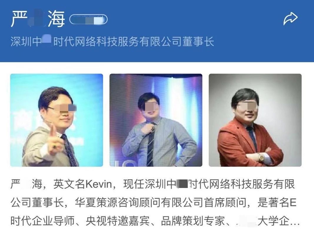 據(jù)介紹,董事長(zhǎng)“嚴(yán)某海”對(duì)外宣傳資料顯示:著名E時(shí)代企業(yè)導(dǎo)師、品牌策劃專家、某知名大學(xué)企業(yè)轉(zhuǎn)型升級(jí)總裁班實(shí)踐導(dǎo)師,擔(dān)任過(guò)多家知名企業(yè)的顧問(wèn)。據(jù)被抓獲的團(tuán)伙成員交代,嚴(yán)某海自稱擁有雙碩士學(xué)歷,是香港大學(xué)學(xué)者,還是牛津大學(xué)博士。