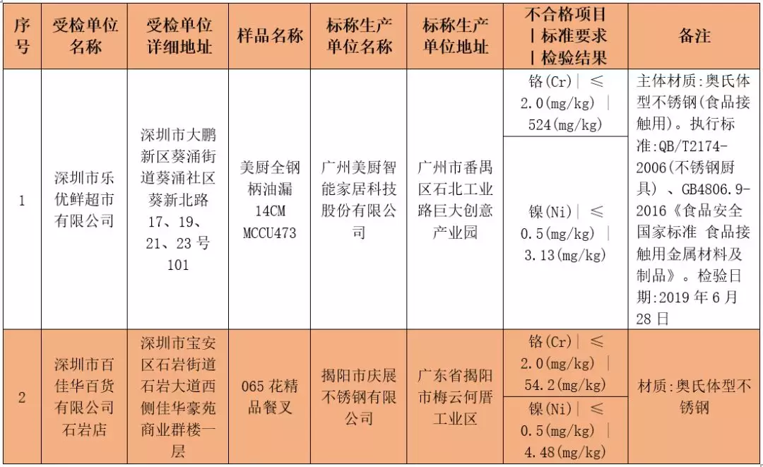 本次共抽檢生產(chǎn)及流通環(huán)節(jié)食品相關產(chǎn)品1174批次,涉及生產(chǎn)、流通環(huán)節(jié)經(jīng)營主體256家,共檢測相關指標6822項次。其中檢出不合格樣品2批次,涉及2家受檢單位,均來自流通領域企業(yè);涉及不合格產(chǎn)品類別均為食品接觸用金屬材料及制品;涉及不合格項目均為鎳(Ni)、鉻(Cr)。