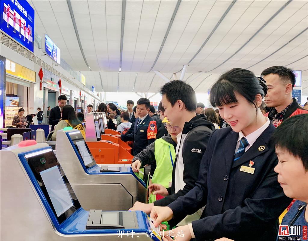 卯時(shí):早晨6點(diǎn)50分左右,深圳北站候車大廳內(nèi),車站工作人員羅瑜欣幫助乘客檢票。
