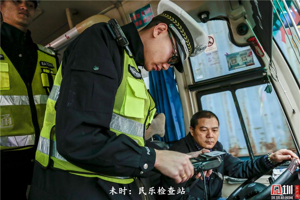 未時(shí):下午14時(shí)50分左右,一名深圳交警民警對(duì)一輛營運(yùn)客車司機(jī)進(jìn)行檢查。