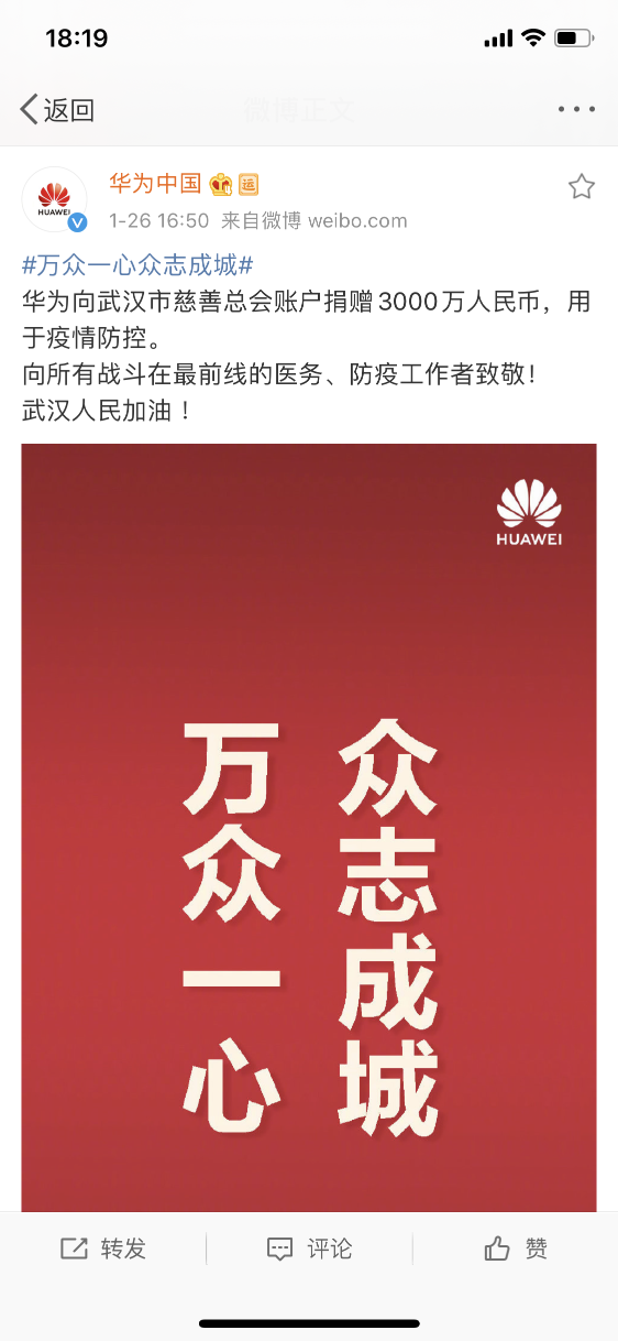 1月26日,華為官方微博“華為中國”宣布,華為向武漢市慈善總會賬戶捐贈3000萬人民幣,用于疫情防控。