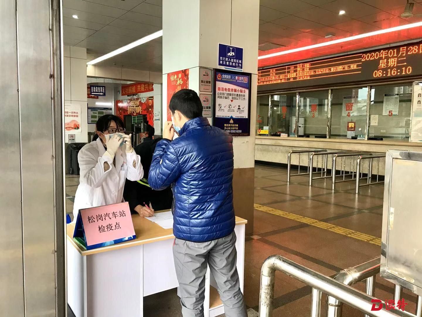 醫(yī)護(hù)人員在松崗汽車站檢疫點(diǎn)教市民正確佩戴口罩
