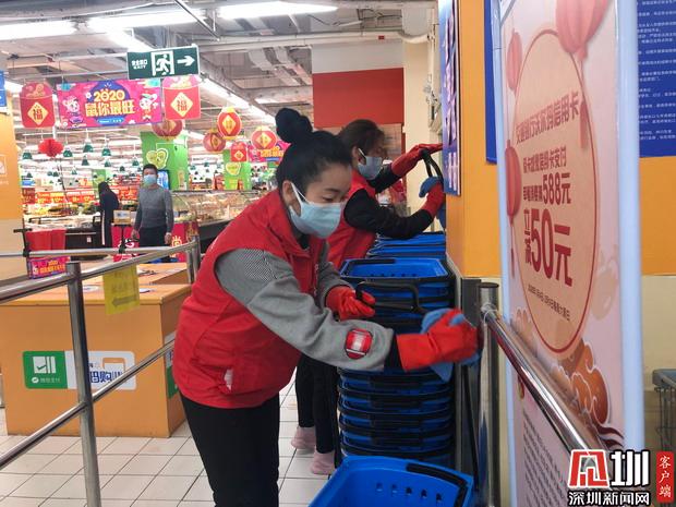 見圳客戶端·深圳新聞網(wǎng)2020年1月31日訊(見圳客戶端、深圳新聞網(wǎng)記者 胡津瑋)戴上口罩、手套,再穿上標(biāo)志性的紅色馬甲,市食藥志愿服務(wù)總隊(duì)的志愿者們紛紛走上超市的各個(gè)崗位,清理貨品、補(bǔ)貨、對(duì)購(gòu)物車購(gòu)物籃進(jìn)行清潔消毒、為來購(gòu)物的市民測(cè)量體溫…據(jù)了解,由于春節(jié)期間各大商超缺少人手,在市市場(chǎng)監(jiān)管局與團(tuán)市委的指導(dǎo)下,市食藥志愿服務(wù)總隊(duì)迅速調(diào)動(dòng)全市在深的食品藥品安全志愿者,成立了由近300名食品藥品安全志愿者組成的春節(jié)“菜籃子”志愿者保障工作小組,為全市各大商超提供志愿服務(wù),全力保障市場(chǎng)供應(yīng)、消除市民顧慮,在防控疫情特殊期間注入了紅馬甲的正能量。記者今天便走訪了深圳的一家超市,尋找這批紅色的身影,了解他們一天的工作。