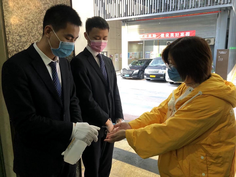值班保安對每個進入進入小區(qū)的人進行體溫測量和消毒