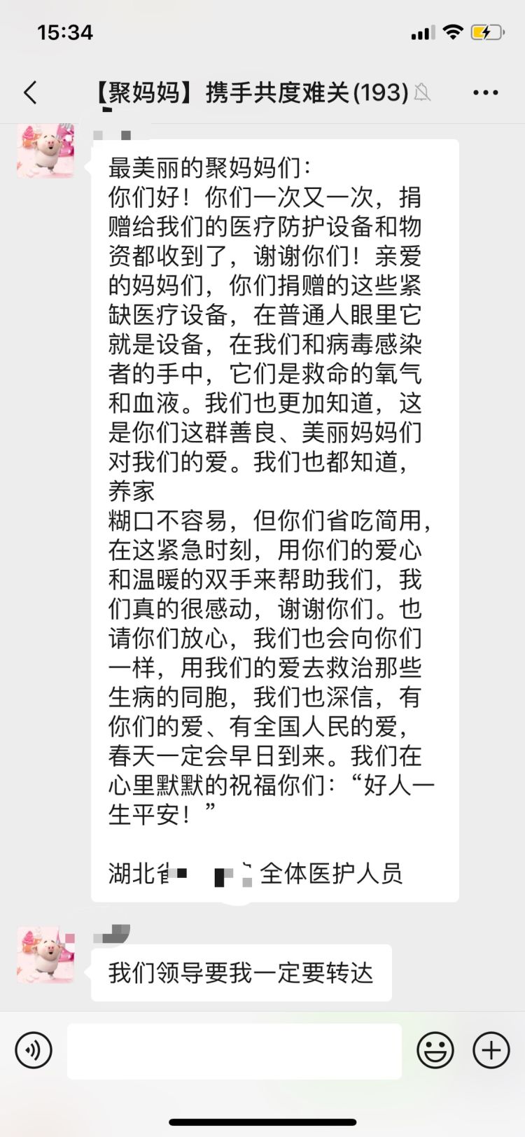 “最美麗的聚媽媽們,你們捐贈的這些緊缺醫(yī)療設(shè)備,在普通人眼里它就是設(shè)備,在我們和病毒感染者的手中,它們是救命的氧氣和血液”,武漢一家醫(yī)院的醫(yī)護(hù)人員在近日發(fā)來的感謝信中說,“請你們放心,我們也會向你們一樣,用我們的愛去救治那些生病的同胞,我們也深信,有你們的愛、有全國人民的愛,春天一定會早日到來?!保ㄓ浾哧愭?