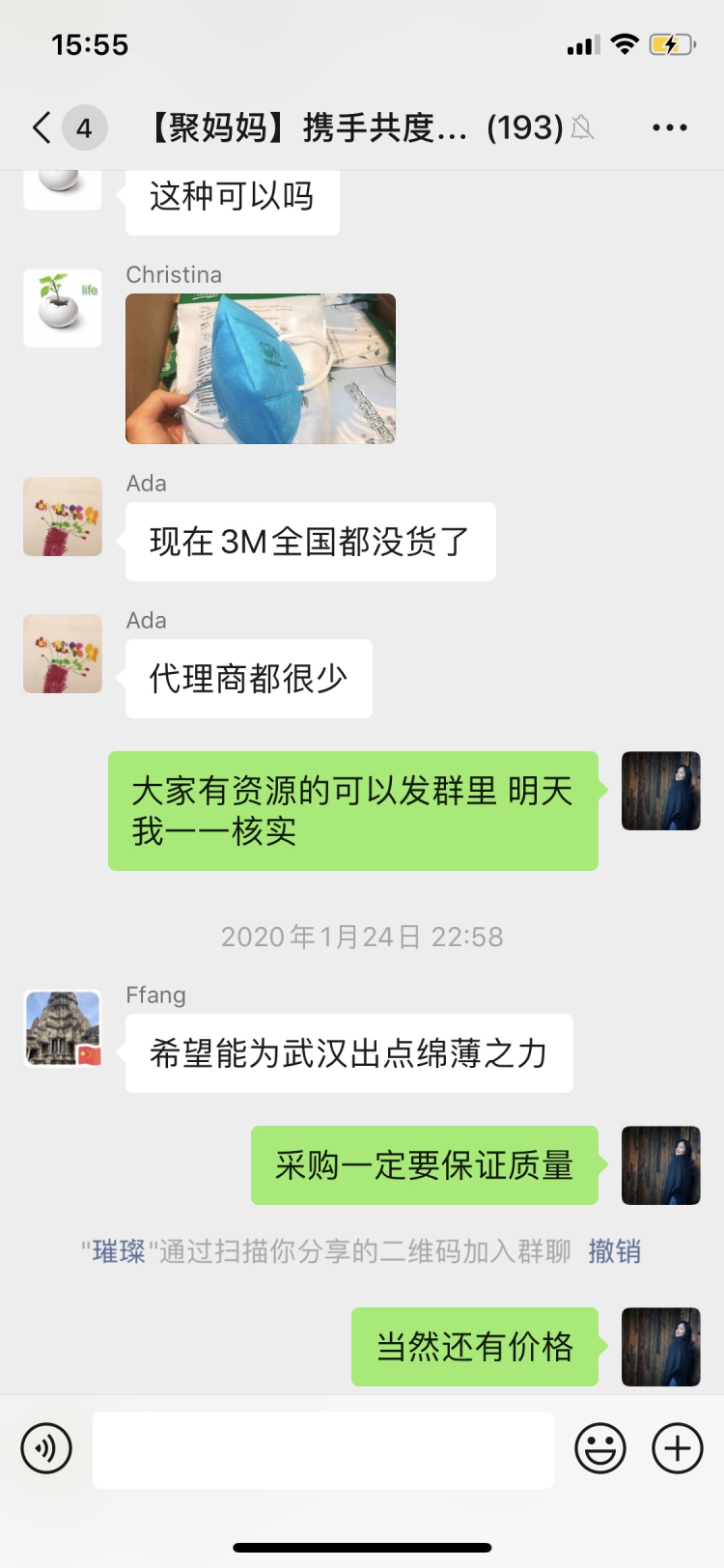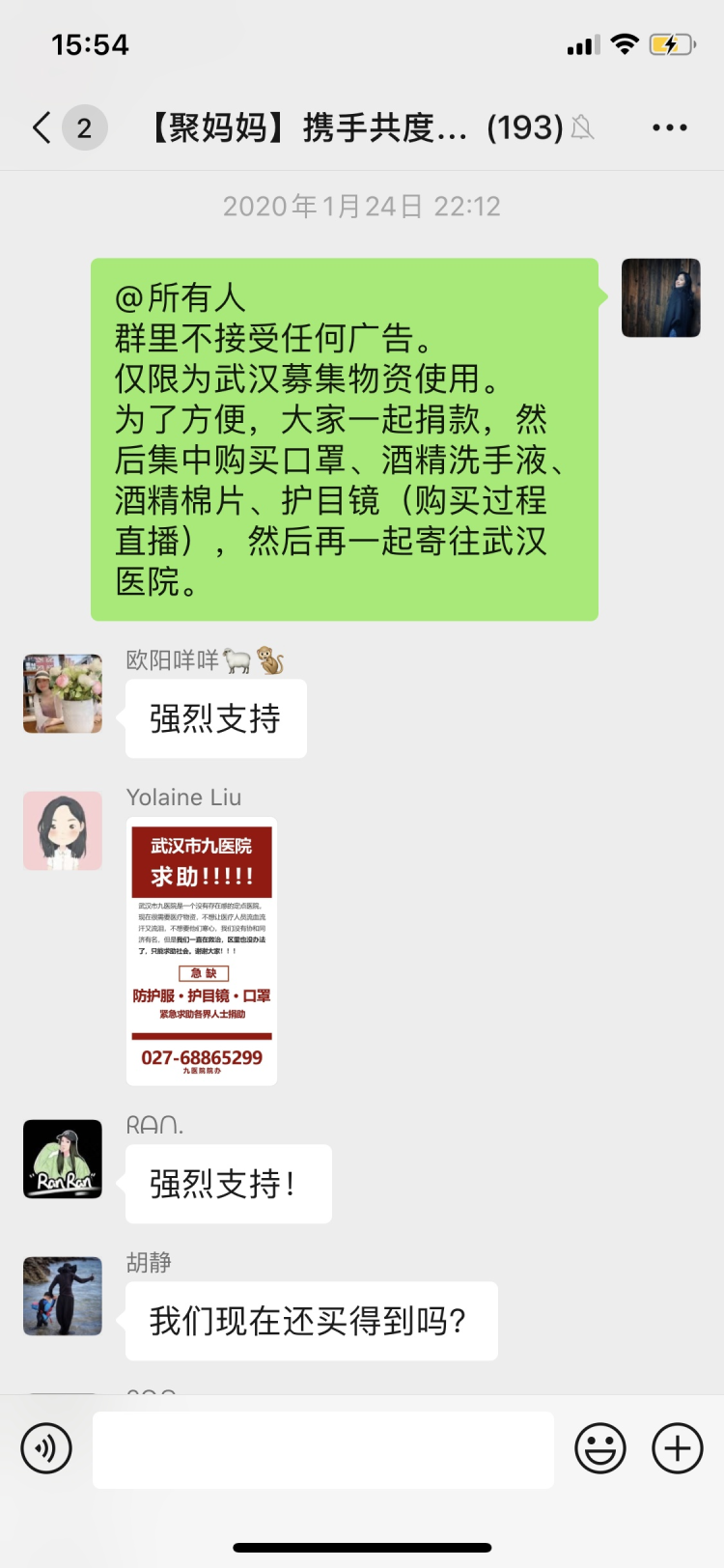 這一百多名媽媽是一個名為“聚媽媽攜手共渡難關(guān)”(以下簡稱“聚媽媽”)微信群的成員,Miya是“聚媽媽”的發(fā)起人之一。1月24日除夕那天,Miya與一位朋友聊起疫情,兩人都覺得,醫(yī)院缺物資,一兩人的力量又太單薄,不如發(fā)動朋友們一起購買直接送到醫(yī)院。Miya在當(dāng)晚9點(diǎn)左右建了這個臨時群,并邀請周圍熟識的朋友加入。