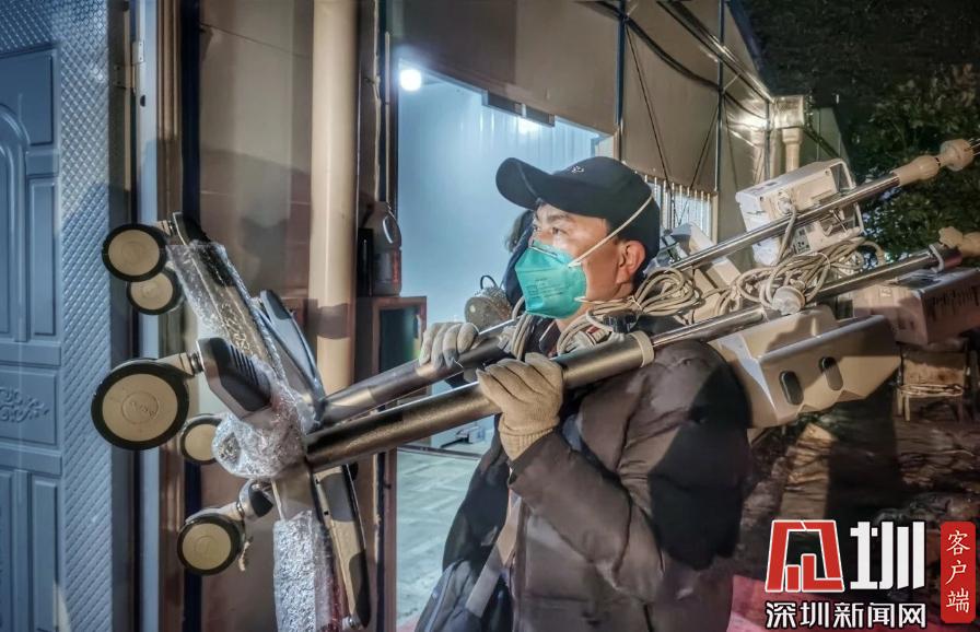 2月2日,工作人員將邁瑞設(shè)備扛進(jìn)火神山醫(yī)院儲藏室。(邁瑞醫(yī)療供圖)