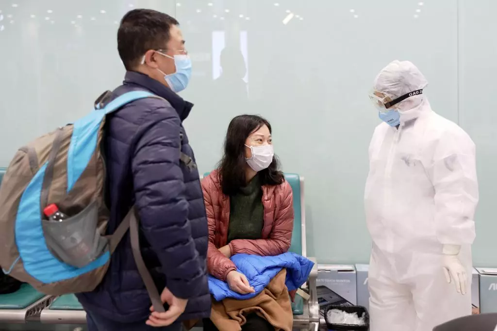 在機場檢疫站旁,醫(yī)務人員對旅客進行詢問和醫(yī)學健康篩查。