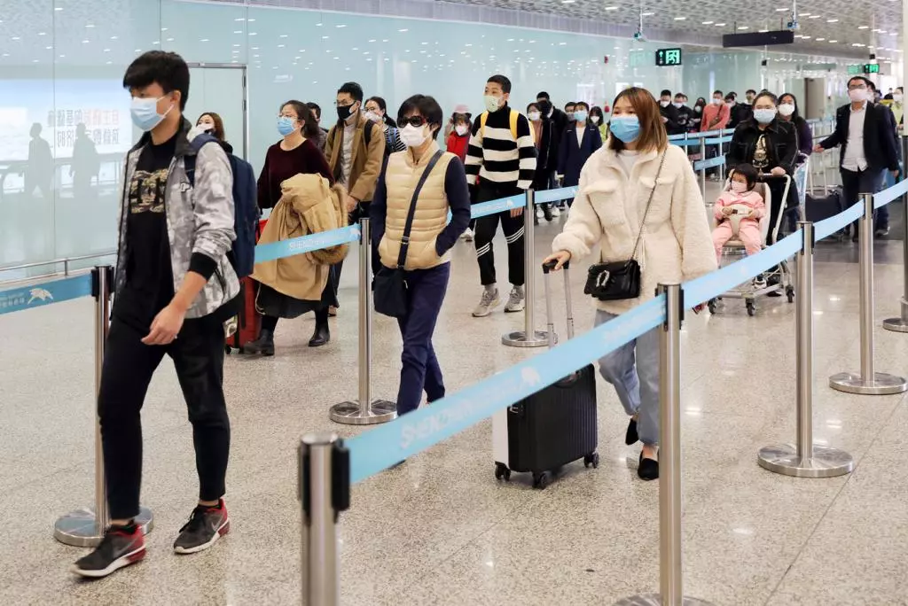 抵深旅客排隊前往出站口,旅客只需走過,便可測出其體溫是否正常。