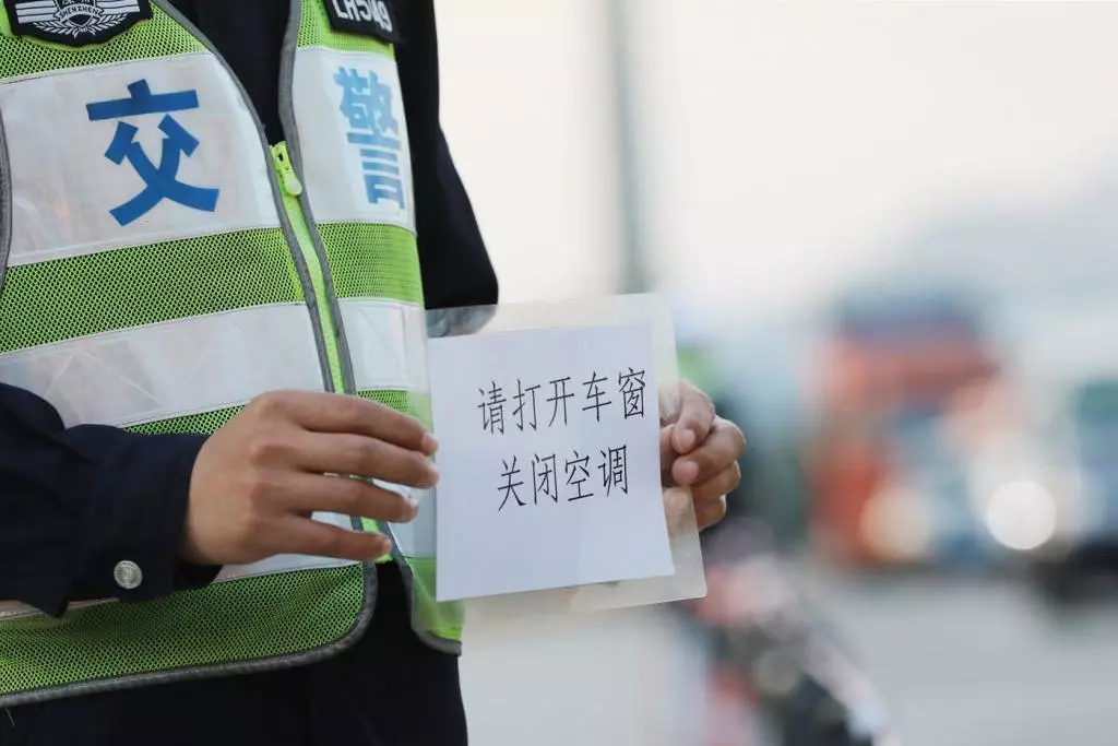 一名交警在高速出口手持檢查“指引”。