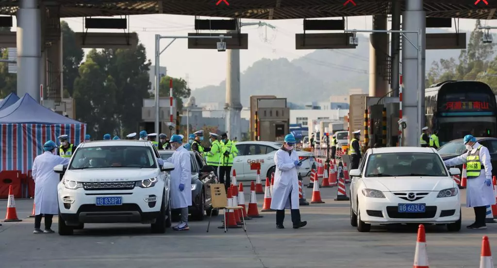 2月2日中午,深晚記者來到梅觀高速觀瀾收費站,發(fā)現這里開通了4條車道供車輛通行,現場有超過20名民警、醫(yī)務人員檢測入深車輛司乘人員的體溫。