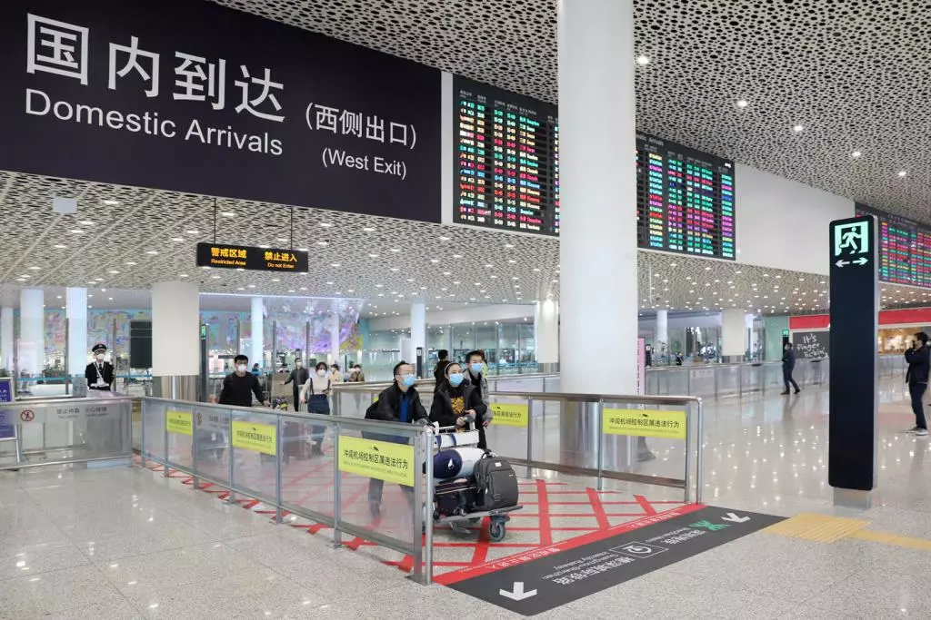 通過體溫檢測后,旅客走出機場出站口。