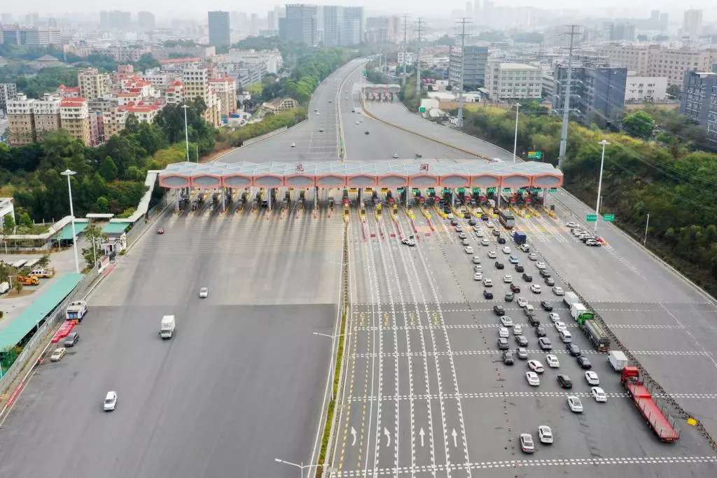 梅觀高速觀瀾收費站,入深方向的車輛排隊依次接受檢查。