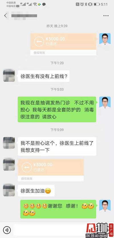 2日上午,寶安中醫(yī)院(集團(tuán))隔離病房工作的徐醫(yī)生,遇到了令他十分感動的事。他通過微信向房東交房租,房東問他是不是在防控前線工作,徐醫(yī)生以為房東怕傳染而嫌棄他,連忙向房東解釋自己做好了防護(hù)消毒,不用擔(dān)心,沒想到房東直接把房租退了回去,表示要支持徐醫(yī)生在前線工作,真是暖心?。?br/>