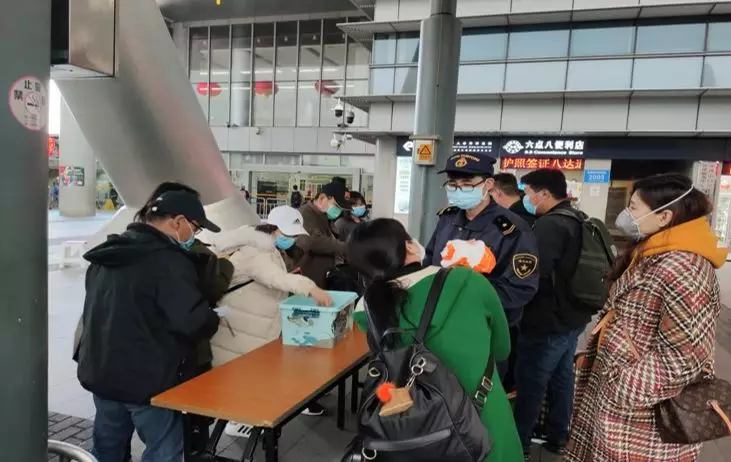 口岸工作人員正在對來往旅客進(jìn)行疫情防控知識宣傳