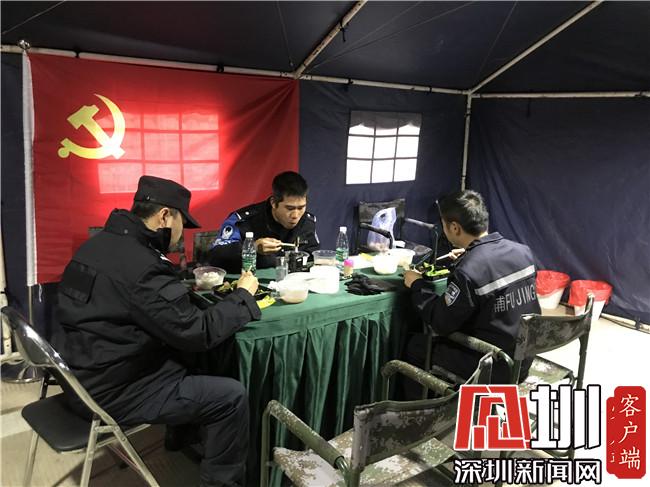 大鵬公安分局機(jī)訓(xùn)大隊的隊員們在帳篷內(nèi)用午餐