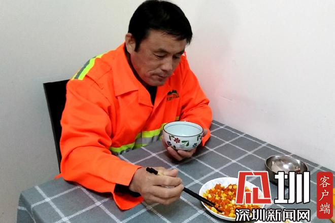 胡蘿卜丁炒玉米,再加一碟土豆絲下飯,這就是黃學(xué)志的午餐。黃學(xué)志說,他有幾年沒回老家了,本來計劃春節(jié)回去過年,順便帶老伴看病,沒想到疫情越來越嚴(yán)重,于是就打消了這個念頭。疫情發(fā)生以來,除了日常工作,他還要負(fù)責(zé)為值班同事普及疫情防控知識的任務(wù)。從早上7點半到12點半,下午1點半到5點半,他每天在沙頭角7個垃圾轉(zhuǎn)運(yùn)站、18個公廁來回奔走,給同事配送口罩及消毒用品,檢查他們的身體健康情況。“現(xiàn)在是疫情防控關(guān)鍵期,我們也希望為防控工作貢獻(xiàn)出來自環(huán)衛(wèi)清潔行業(yè)的一份力量?!秉S學(xué)志說。(見圳客戶端、深圳新聞網(wǎng)記者鄧雪婷)