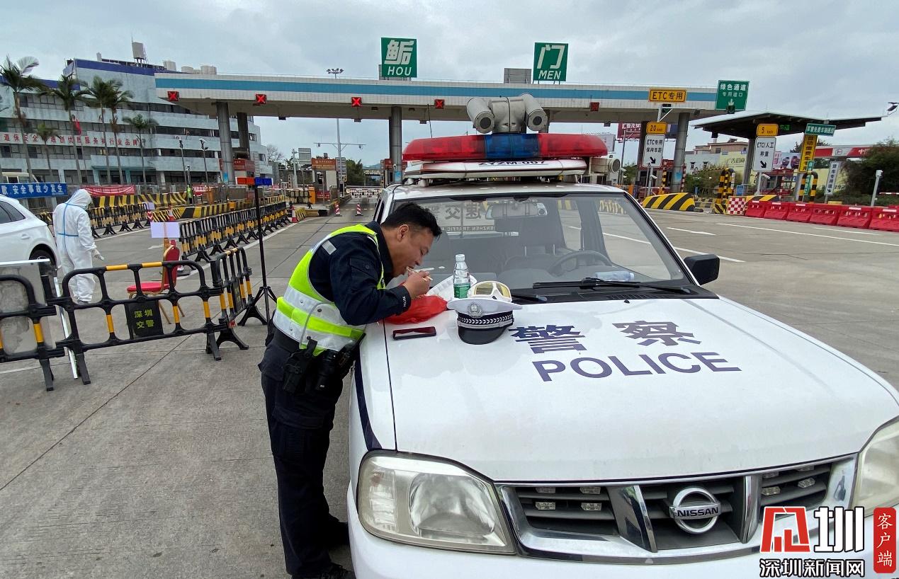 蘇廷源在鲘門高速口防疫檢查站執(zhí)勤,對進(jìn)入深汕合作區(qū)的車輛及人員進(jìn)行逐一排查。排查途中,蘇廷源抽空在警車旁迅速解決了自己的午餐。(見圳客戶端、深圳新聞網(wǎng)記者羅瑜)