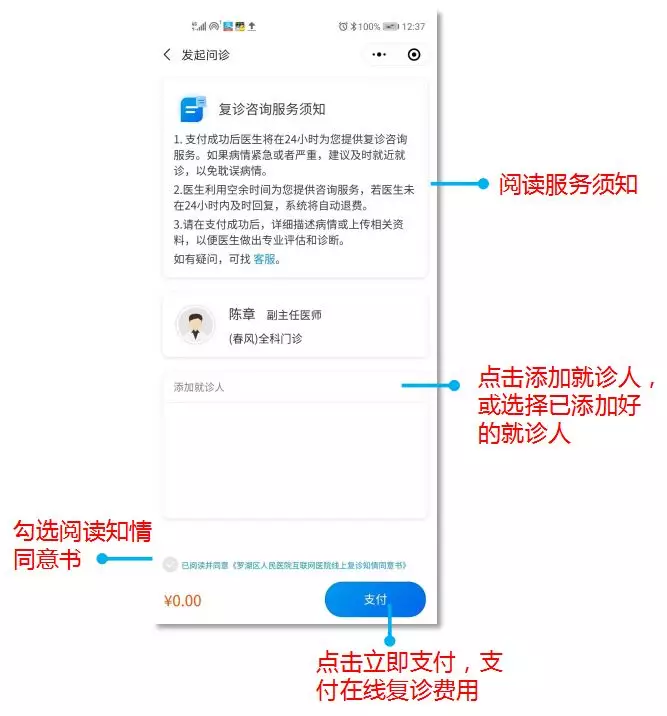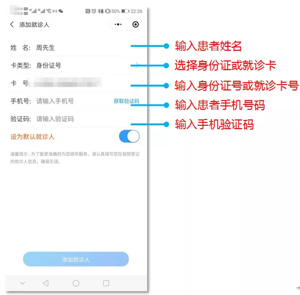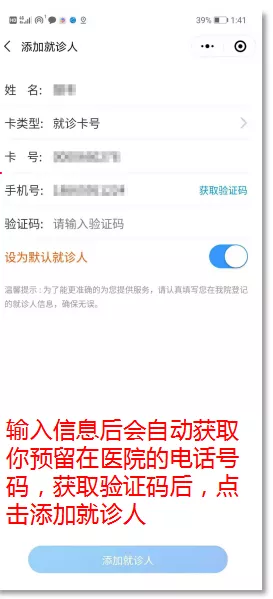 患者首次進入診室,需添加就診人,輸入在醫(yī)院的就診信息,綁定身份。