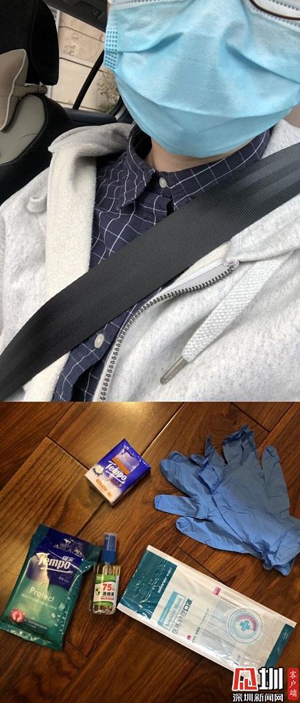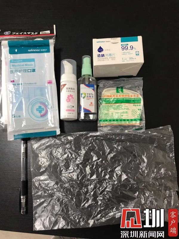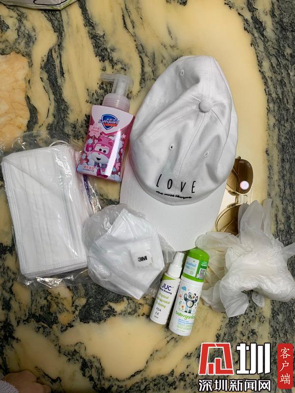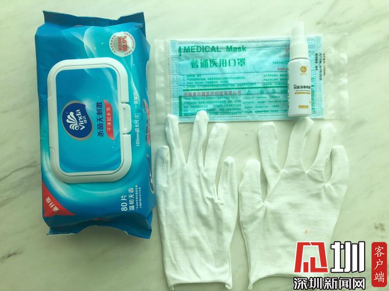 家住福田,在羅湖上班的丘小姐今天也開始了他的復(fù)工第一天,為了在路上做好防護(hù),她準(zhǔn)備了一次性雨衣、鞋套、手套及眼鏡,當(dāng)然口罩必不可少,她還隨身攜帶了含有酒精的免洗洗手液,以備接觸了可疑物品之后能馬上自我消毒。