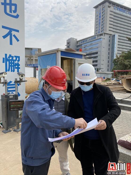 龍海波(左一)在“深圳版火神山”——市第三人民醫(yī)院二期工程臨時院區(qū)項目現場勘察供電線路。(蕭新敏 攝)