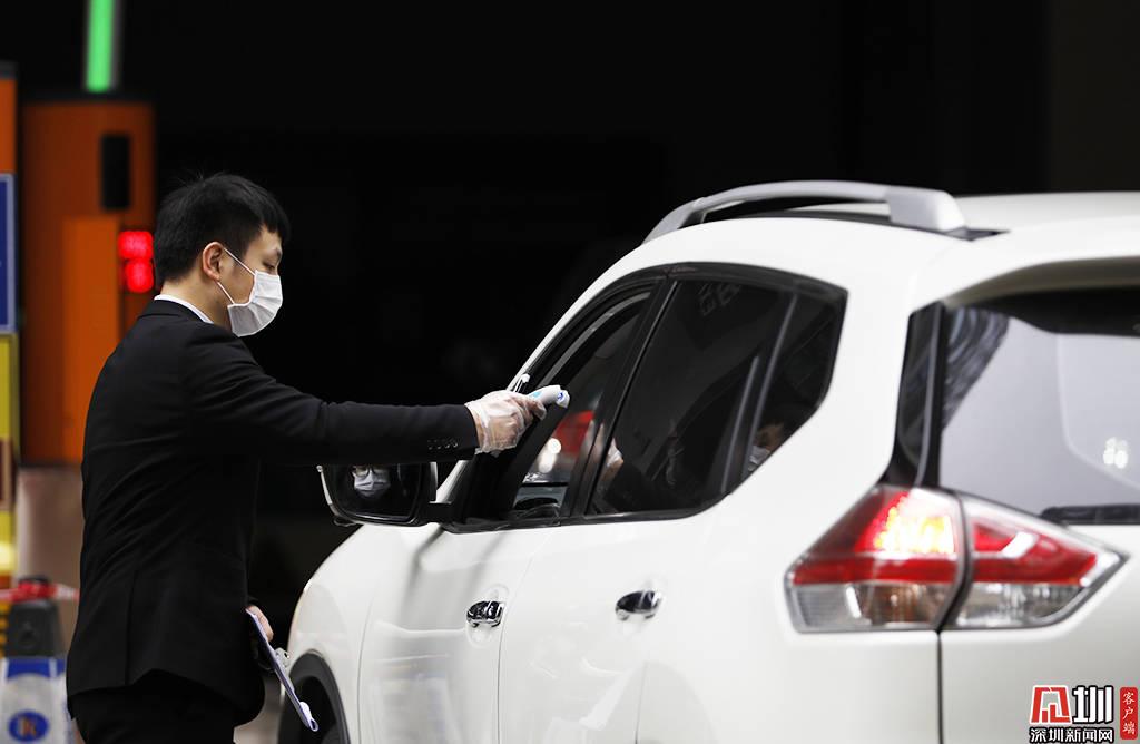 深圳軟件產(chǎn)業(yè)基地的一個停車場入口,一位工作人員正在為入場的司機(jī)測體溫。