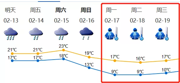 13-15日日溫差小,最低氣溫17-18℃,最高氣溫21-23℃;