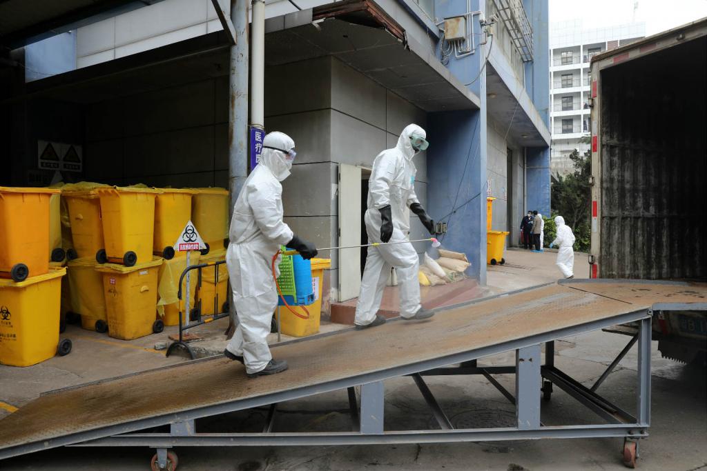 ▲卸完醫(yī)療廢物后,工作人員對卸料區(qū)域進行消毒。