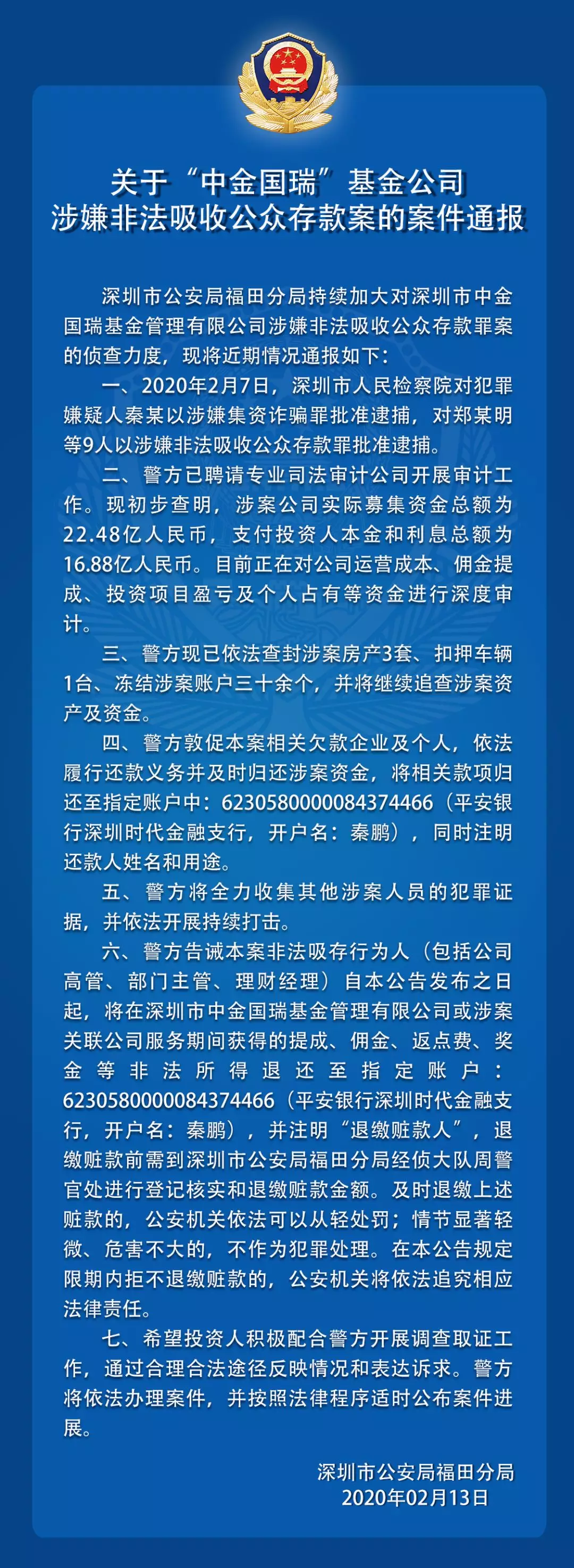關(guān)于“中金國(guó)瑞”基金公司涉嫌非法吸收公眾存款案的案件通報(bào)