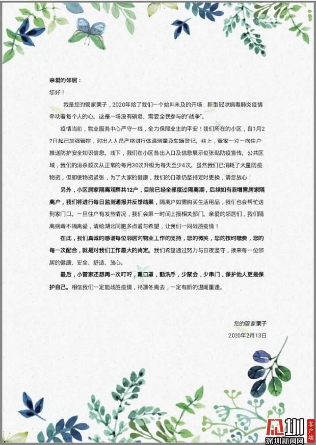 見圳客戶端·深圳新聞網(wǎng)2020年2月13日訊(見圳客戶端·深圳新聞網(wǎng)記者 潘潤華)“他們對疫情的恐懼并不少半分,可卻堅持在工作崗位?!薄八麄兙褪俏覀冃哪恐械哪嫘姓?。守護著我們的安全?!苯?,一幕幕暖心畫面在深圳上演,不少業(yè)主紛紛踴躍為物業(yè)員工捐款,以表達對這些“平安守護者”“逆行人”的謝意。