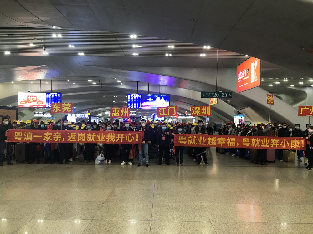 見圳客戶端·深圳新聞網(wǎng)2020年2月19日訊 2月18日14時36分,載有496名云南籍務(wù)工人員的D4856次列車從昆明南站開出,于當(dāng)日22時36分抵達(dá)廣州南站,全面拉開了省際協(xié)作組織異地務(wù)工人員節(jié)后有序返粵返崗的序幕。據(jù)悉,這是廣東省人社廳和云南省人社廳共同策劃,“點(diǎn)對點(diǎn)”訂制打造的首趟返粵專列,車上的乘客都是節(jié)前已在廣東就業(yè)的返鄉(xiāng)員工,分別來自云南昆明、曲靖、紅河、昭通等7個市州。雖然現(xiàn)在新冠肺炎疫情還未完全過去,但這496名務(wù)工人員將帶著政府免費(fèi)提供的返崗專列“大禮包”,乘著憧憬與希望,分別前往廣州、深圳、佛山、東莞、惠州等市開始新一年的工作和生活。來自云南文山州的李先生在采訪中激動表示,自己已在廣東工作兩年多,廣東的就業(yè)環(huán)境好,這次能在政府幫助下免費(fèi)回來上班,一路上還有人社部門工作人員帶隊(duì)指引,感到非常幸運(yùn),一定會好好珍惜,努力工作。