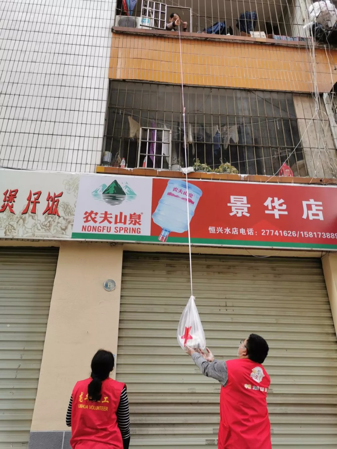 “為了實(shí)現(xiàn)無接觸配送,每天阿姨會把繩索放下來,她會電話告訴我們需要的菜品和生活用品,我們把她需要的東西都‘送’上去”。趙發(fā)威日常除了服務(wù)社區(qū)弱勢群體購買生活必需品,還承擔(dān)機(jī)動崗為需要替崗的志愿者“愛心接力”、執(zhí)行社區(qū)抗疫檢測點(diǎn)的測溫登記工作。