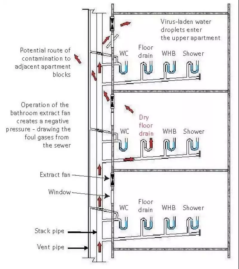 由于干涸的U型管內(nèi)存在帶病毒的污染物,而這些污染物處于暴露狀態(tài),可能通過地漏、甚至排風扇循環(huán)等其中的污染顆粒被人吸入導致感染。