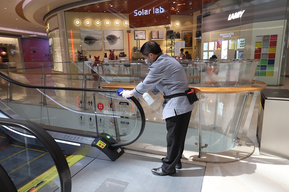 “這些可能與人產(chǎn)生近距離接觸的地方是消毒清潔的重點(diǎn)?!币挤匠俏飿I(yè)負(fù)責(zé)人表示,疫情以來(lái),商場(chǎng)及時(shí)采購(gòu)口罩、手套、防護(hù)服、消毒水等防疫物資,并在原有基礎(chǔ)上進(jìn)一步加強(qiáng)購(gòu)物空間的清潔衛(wèi)生和消毒,尤其是扶梯、電梯、衛(wèi)生間等重點(diǎn)區(qū)位的消殺。此外,商場(chǎng)強(qiáng)化了新風(fēng)系統(tǒng)的工作,保證空氣流通,多管齊下,確保衛(wèi)生工作嚴(yán)標(biāo)準(zhǔn)、多頻次、無(wú)死角。