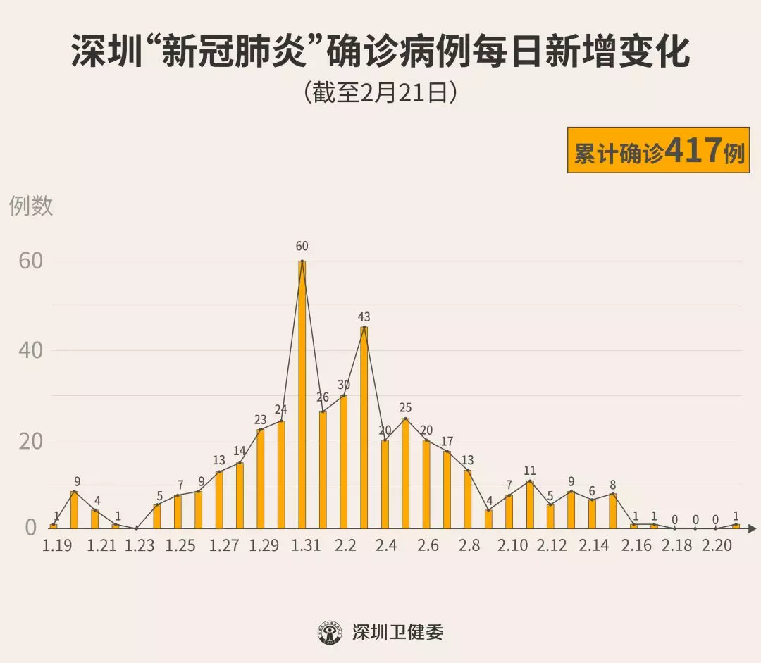 截至2月21日24時,深圳累計報告“新冠肺炎”確診病例417例。2月21日當天全市新增確診病例1例(個案詳情今晚公布)。 ▲新增出院病例已超過新增確診病例 累計報告確診病例中,男性197例、女性220例。 按照病例管理地區(qū)劃分,南山區(qū)87例、福田區(qū)81例、龍崗區(qū)71例、寶安區(qū)62例、龍華區(qū)34例、羅湖區(qū)32例、光明區(qū)11例、坪山區(qū)7例、鹽田區(qū)6例、大鵬新區(qū)2例、其他(指由機場、車站、碼頭、關口、路卡等直接送往定點醫(yī)院的)24例。 目前,重癥10例、危重癥9例,死亡2例,累計出院222例。 193例確診病例均在深圳市第三人民醫(yī)院隔離治療。 202例密切接觸者正在接受醫(yī)學觀察。 資料來源:深圳市疾控中心、深圳市衛(wèi)健委、廣東省衛(wèi)健委