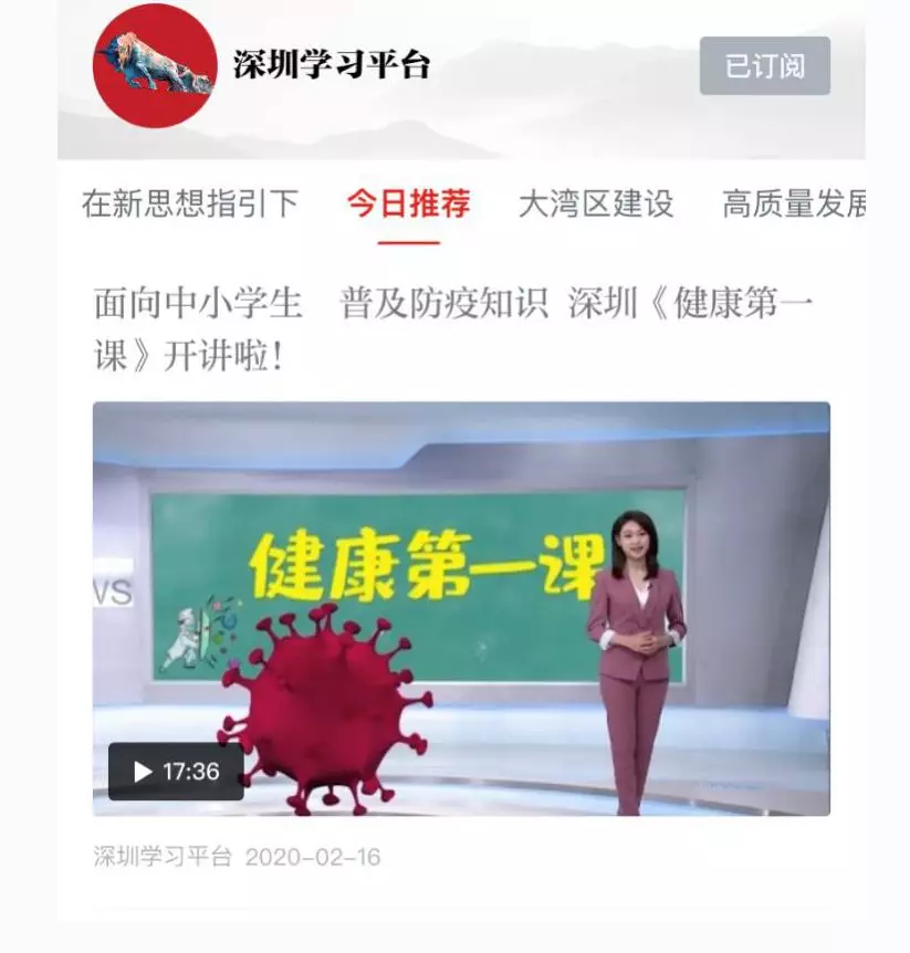 2月17日,“學習強國”深圳學習平臺編輯部和深圳市疾控中心聯(lián)合策劃推出的《健康第一課》節(jié)目在“學習強國”深圳學習平臺首發(fā),宣傳普及新型冠狀病毒肺炎防控知識,助力做好學校疫情防控工作,廣大學生家長積極收看,反響良好。