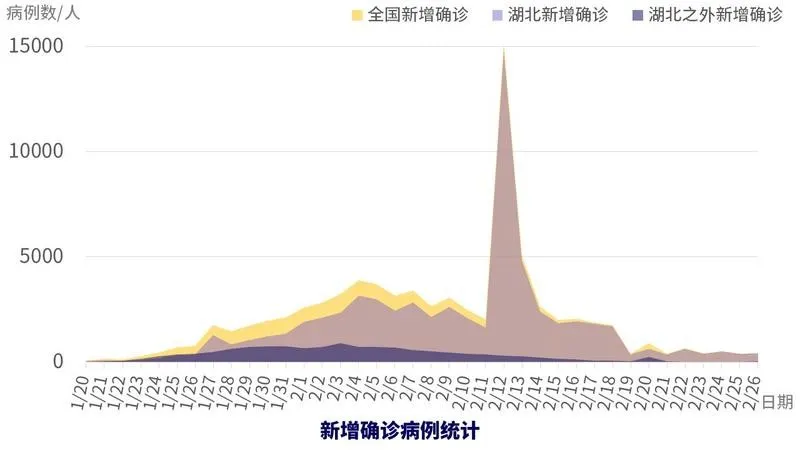 目前每日新增確診病例呈下降趨勢。2月3日,非湖北地區(qū)新增確診病例達到最高峰890例,之后逐漸下降(2月20日監(jiān)獄系統(tǒng)新增確診病例,造成數據波動),2月26日新增確診病例降至24例,為最高峰的2.7%,前一天新增病例5例,僅為最高峰的0.56%。湖北地區(qū)新增確診病例在2月4日達到最高峰3156例(2月12日,2月13日,由于確診標準的改變,造成數據波動),隨后基本呈下降趨勢,2月26日新增確診409例,為最高峰的12.96%。