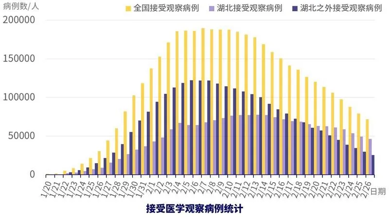 還值得關注的是正在接受醫(yī)學觀察的人數,在全國嚴格管控的情況下,未來新增確診病例很大比例會來自這部分人群。從數據中可以看到,非湖北地區(qū)接受醫(yī)學觀察人數正在快速下降,湖北地區(qū)的也在穩(wěn)步下降中,這可能預示著未來新增確診病例也將下降。