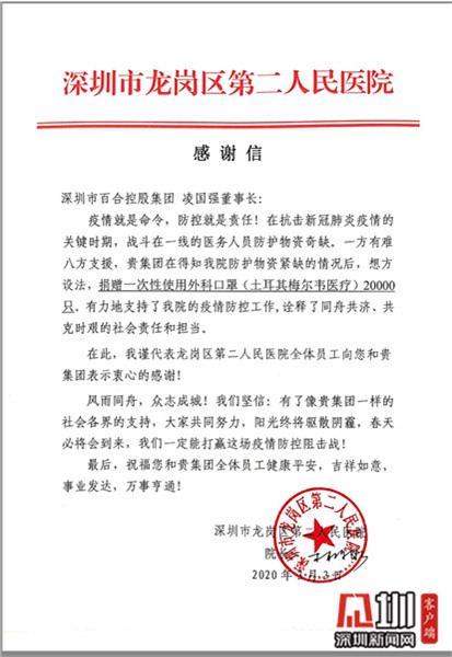 “我不認(rèn)識你,但我要謝謝你!”3月2日,龍崗區(qū)第二人民醫(yī)院院長林源泉還特地向百合集團(tuán)凌國強(qiáng)董事長寫了一封感謝信。